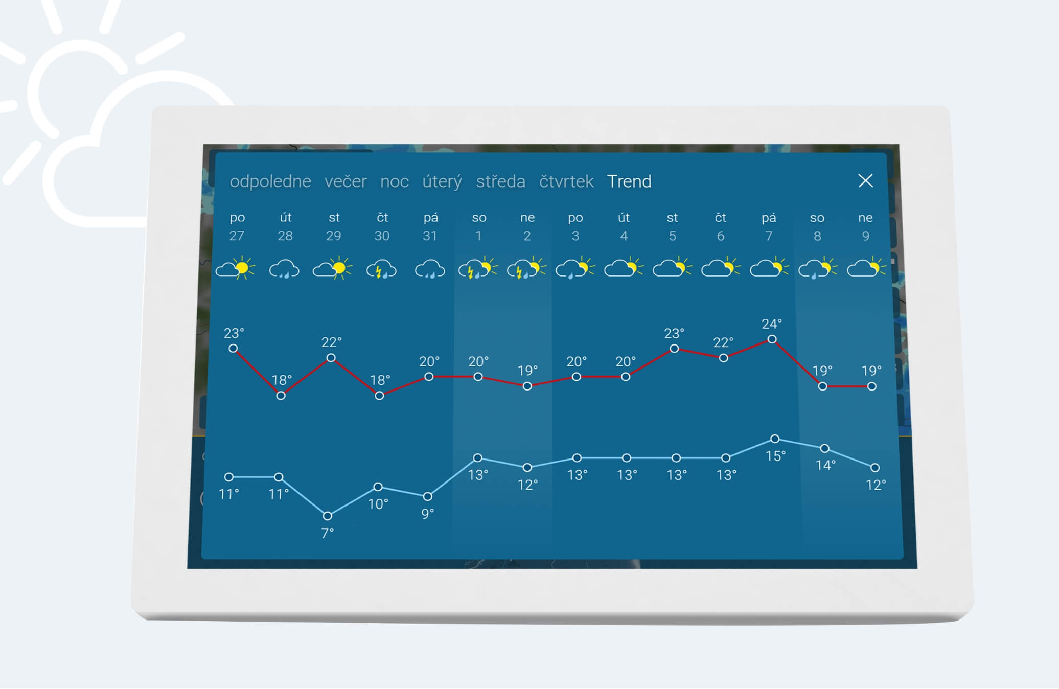 V dolní části obrazovky se vlevo přehledně a stručně zobrazuje počasí v průběhu dne a vpravo trend počasí pro nadcházející dny. Uprostřed se zobrazuje čas a aktuální teplota.
