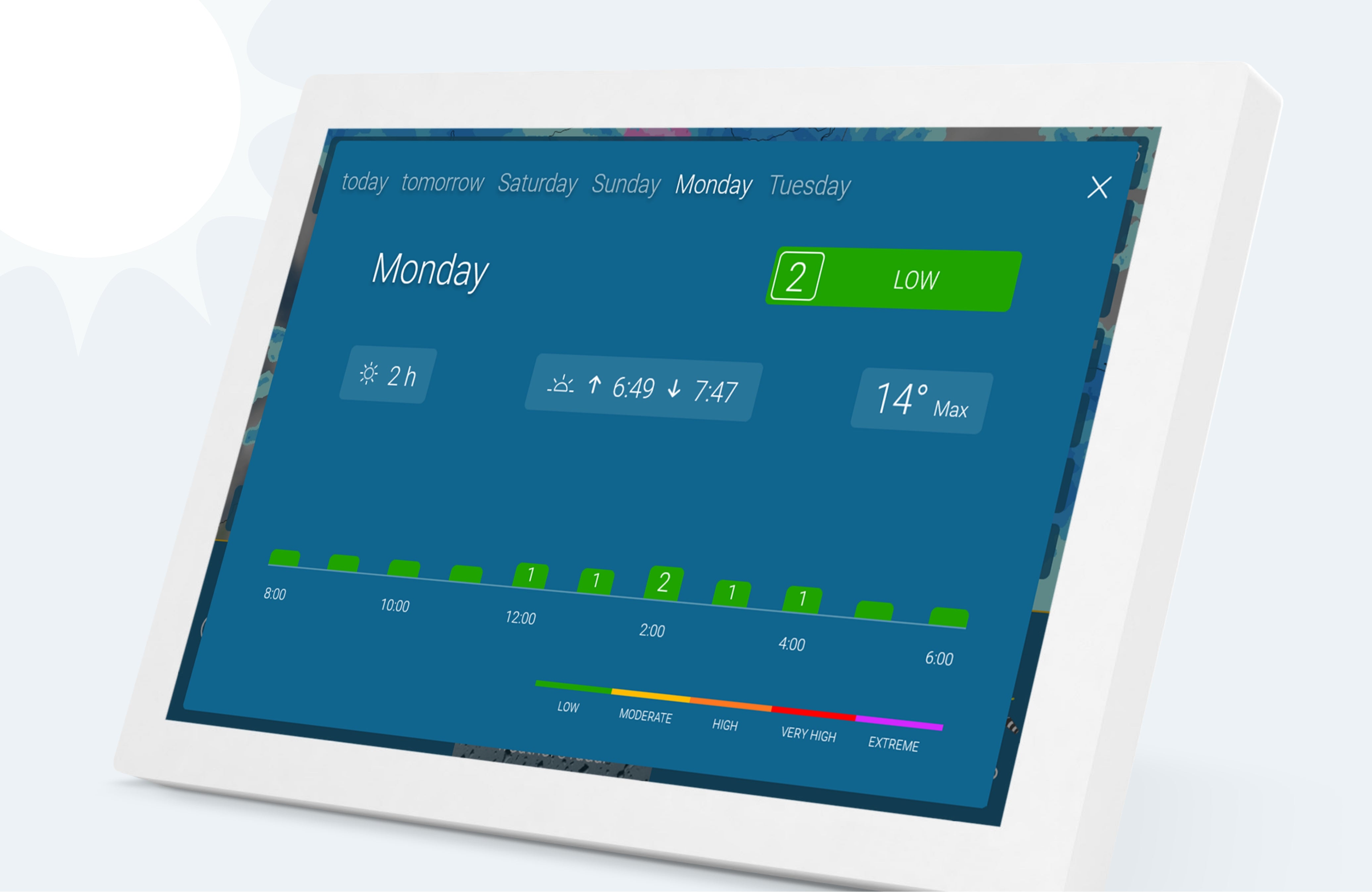 The new indoor sensor contributes to a pleasant climate in your home. The temperature and humidity information can help with efficient heating and ventilation, for example. For allergy sufferers, even more detailed information on pollen levels and a pollen calendar are now available. These facilitate both short- and long-term planning. The UV index is now displayed not only for the current day, but also for the next six days. The levels range from "low" to "extreme" and give an indication of what measures should be taken to protect against the harmful UV radiation.
