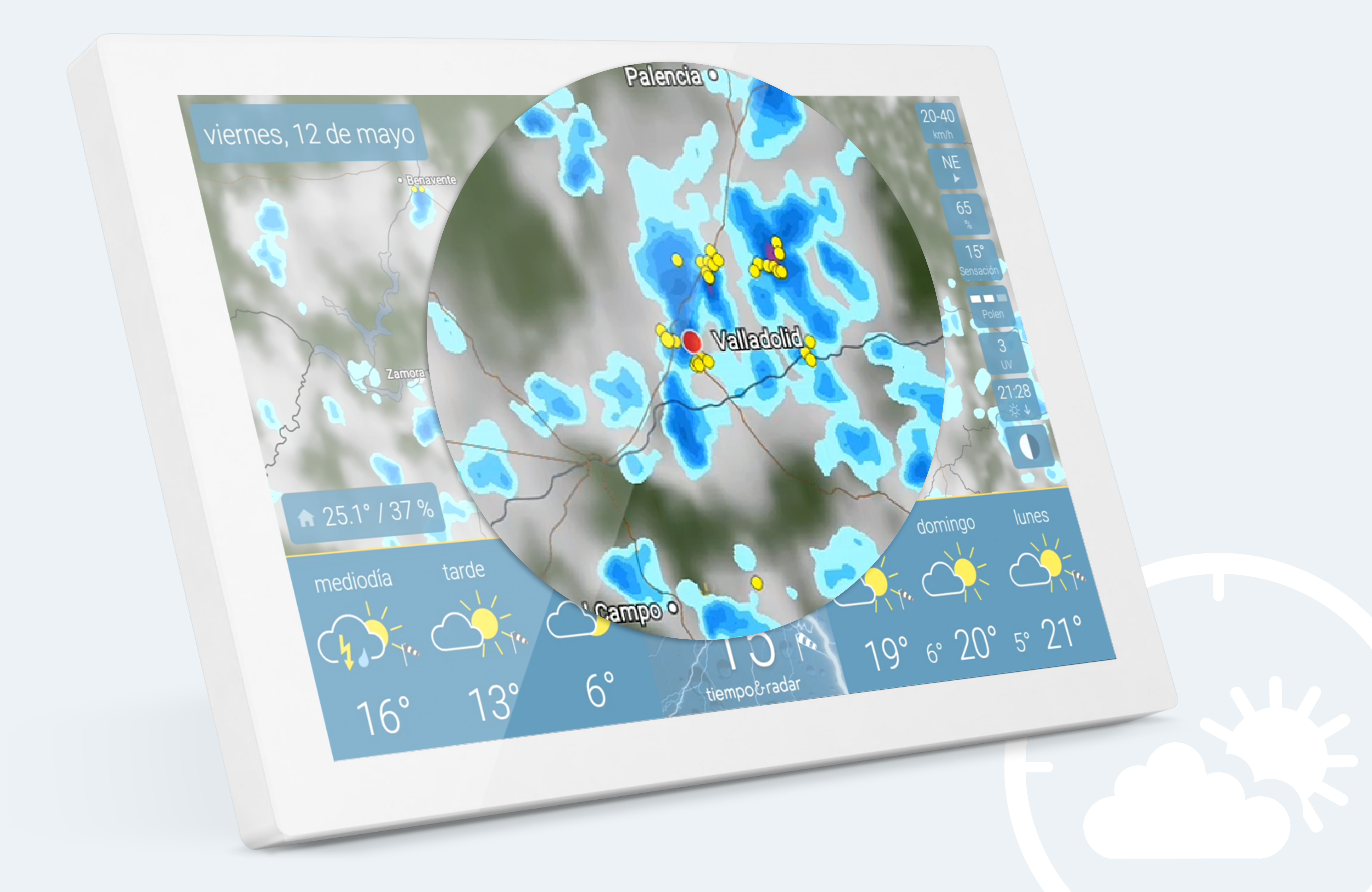 Para poner en marcha tiempo&radar home 3 es suficiente con conectarla a la red eléctrica. Luego, el programa te guía paso a paso durante la configuración. Después de detectar automáticamente la ubicación, se muestra inmediatamente el tiempo que hará en tu localidad. Puedes elegir en qué idioma quieres ver el tiempo entre los 15 disponibles: español, alemán, inglés, francés, neerlandés, danés, , italiano, portugués, polaco, checo, eslovaco, esloveno, húngaro, rumano y búlgaro.