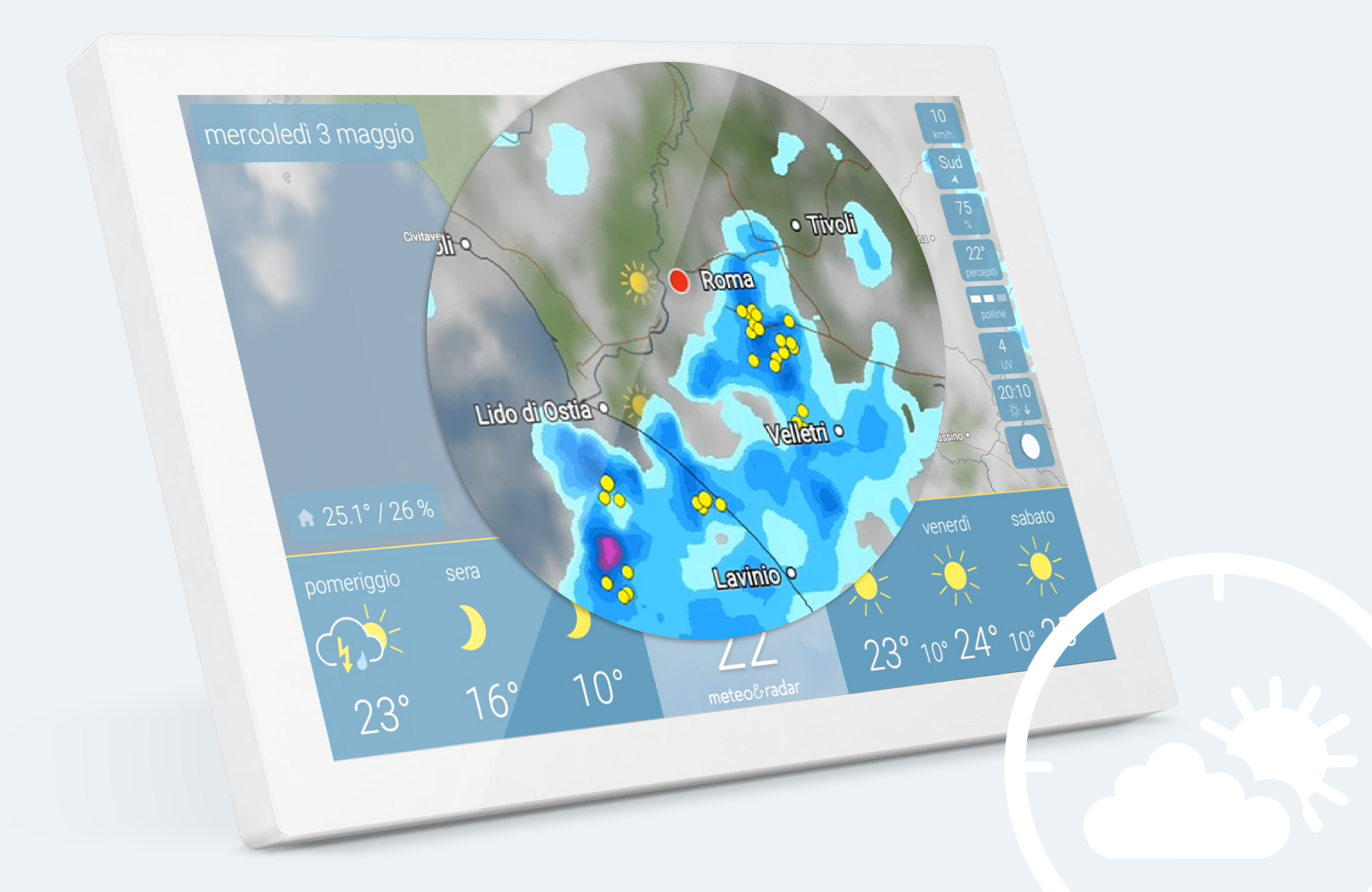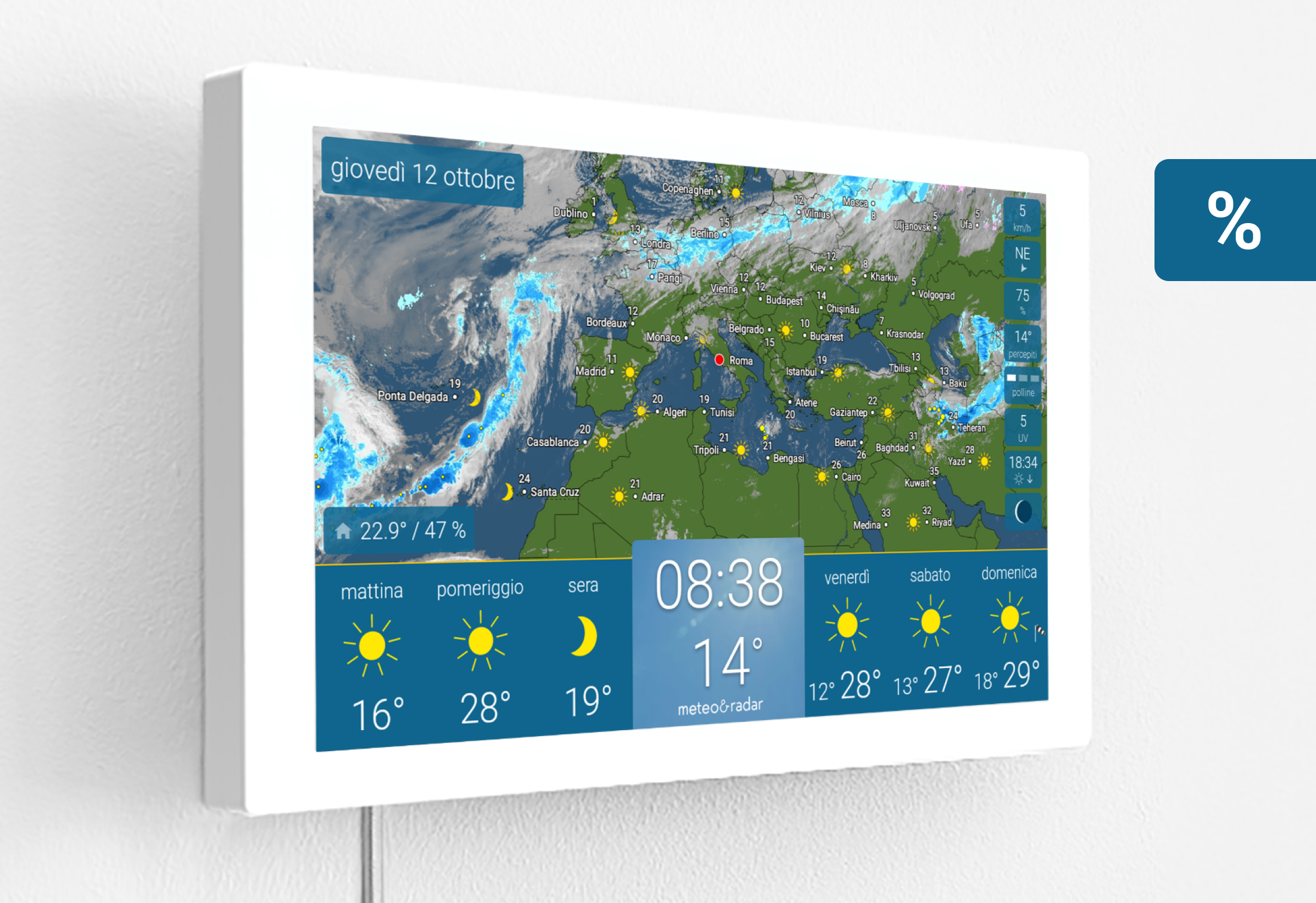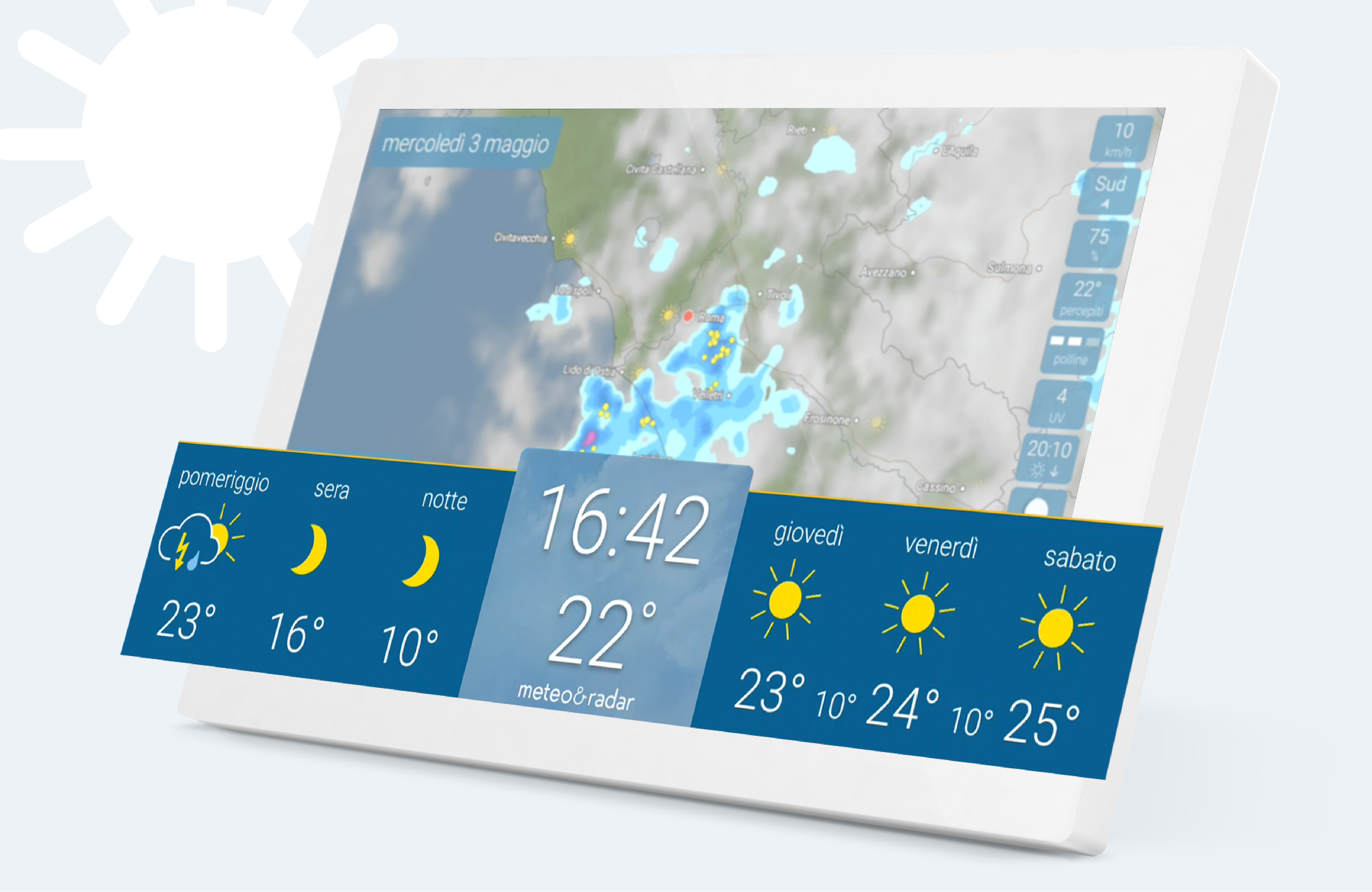 - Meteo sempre a portata di mano – grazie al supporto da parete appositamente sviluppato