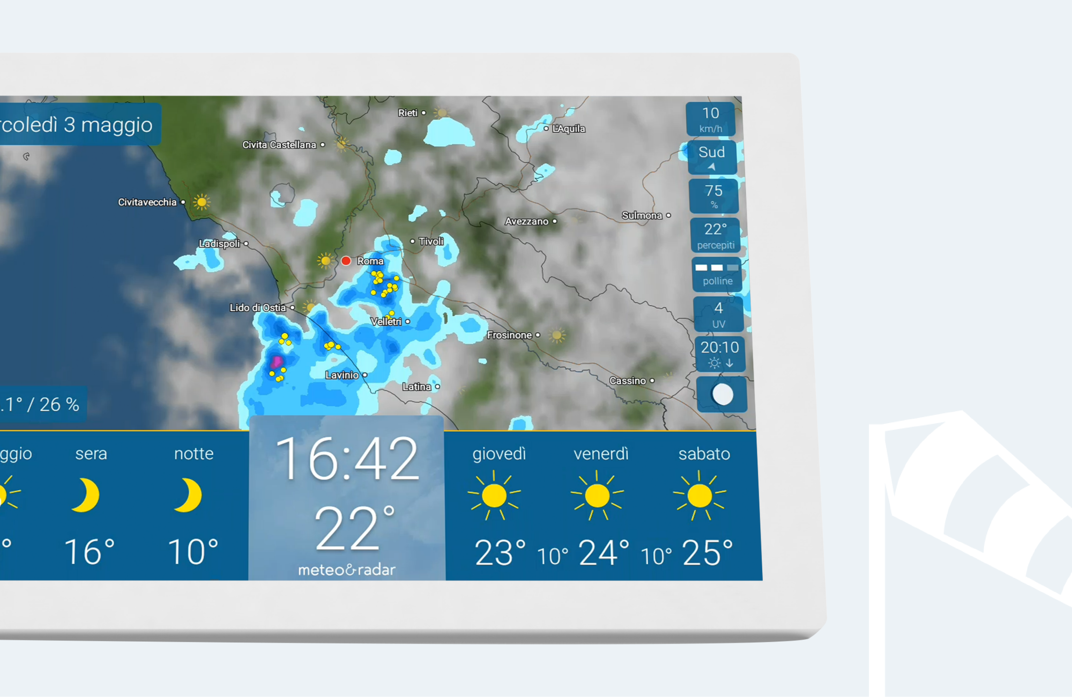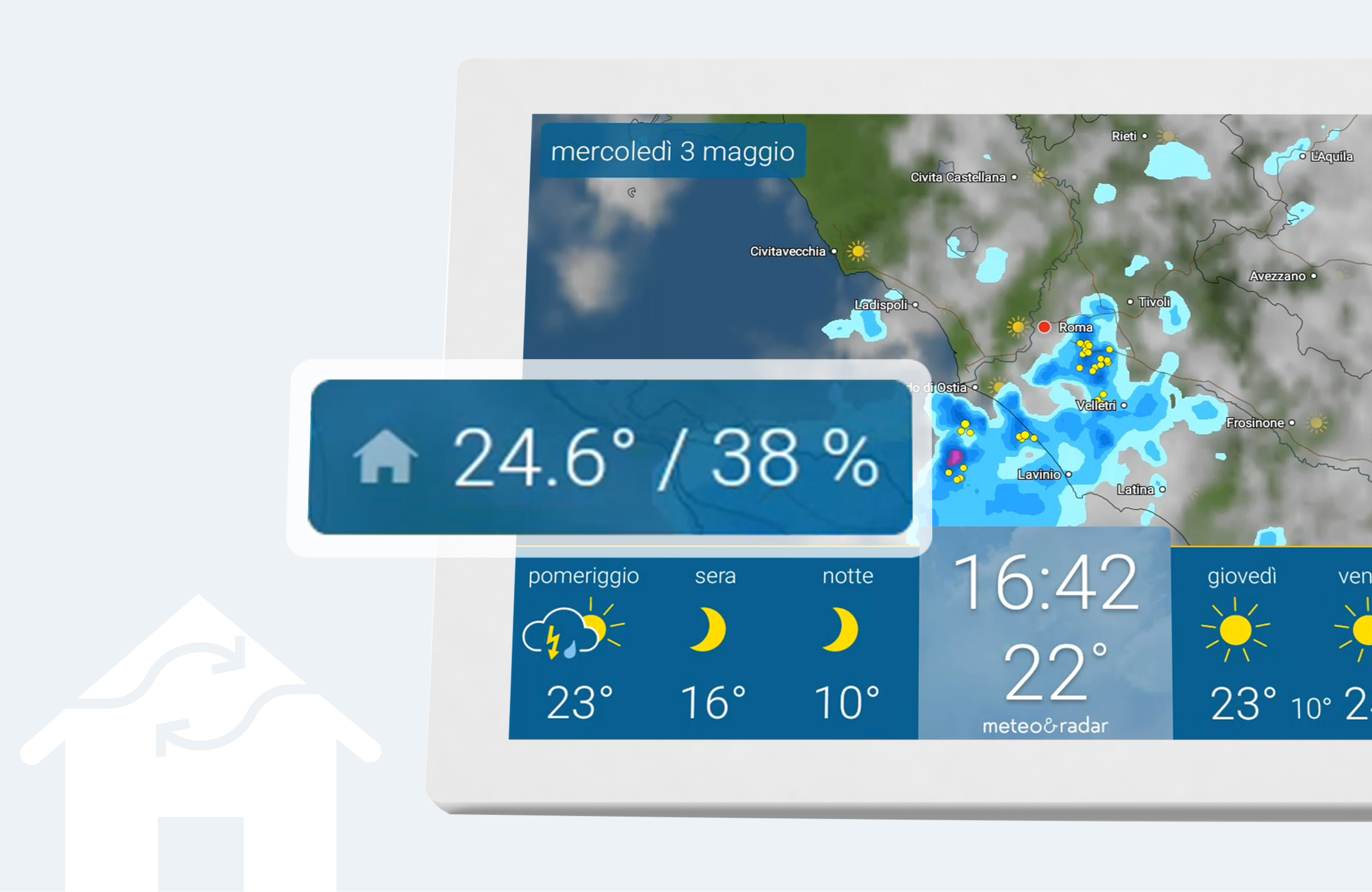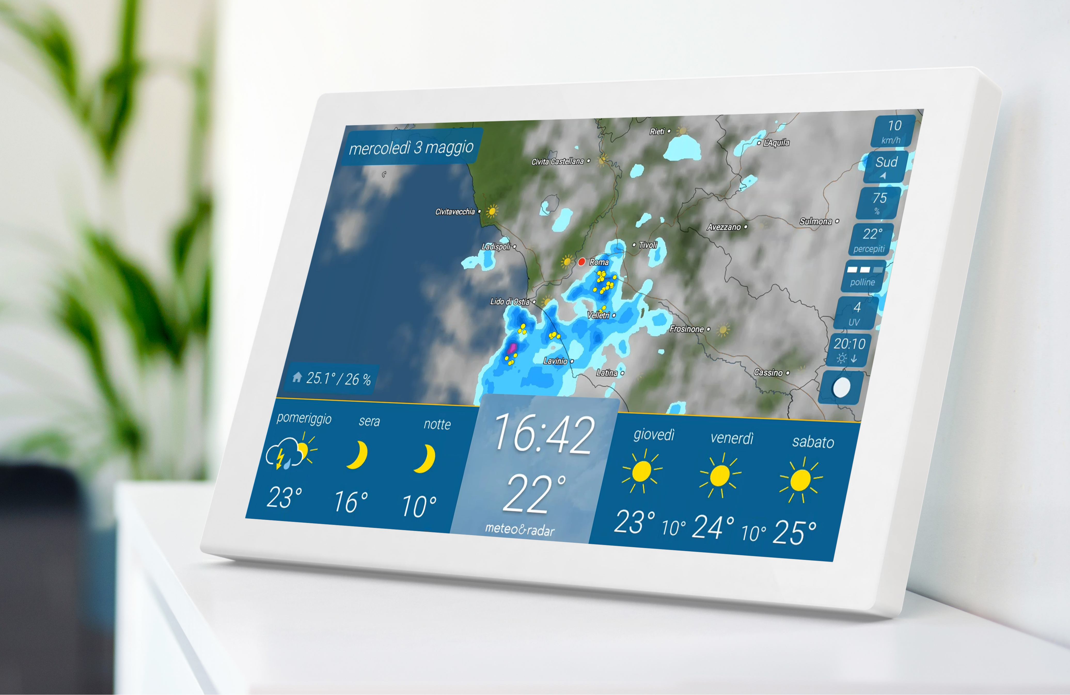 - Meteo sempre a portata di mano – grazie al supporto da parete appositamente sviluppato