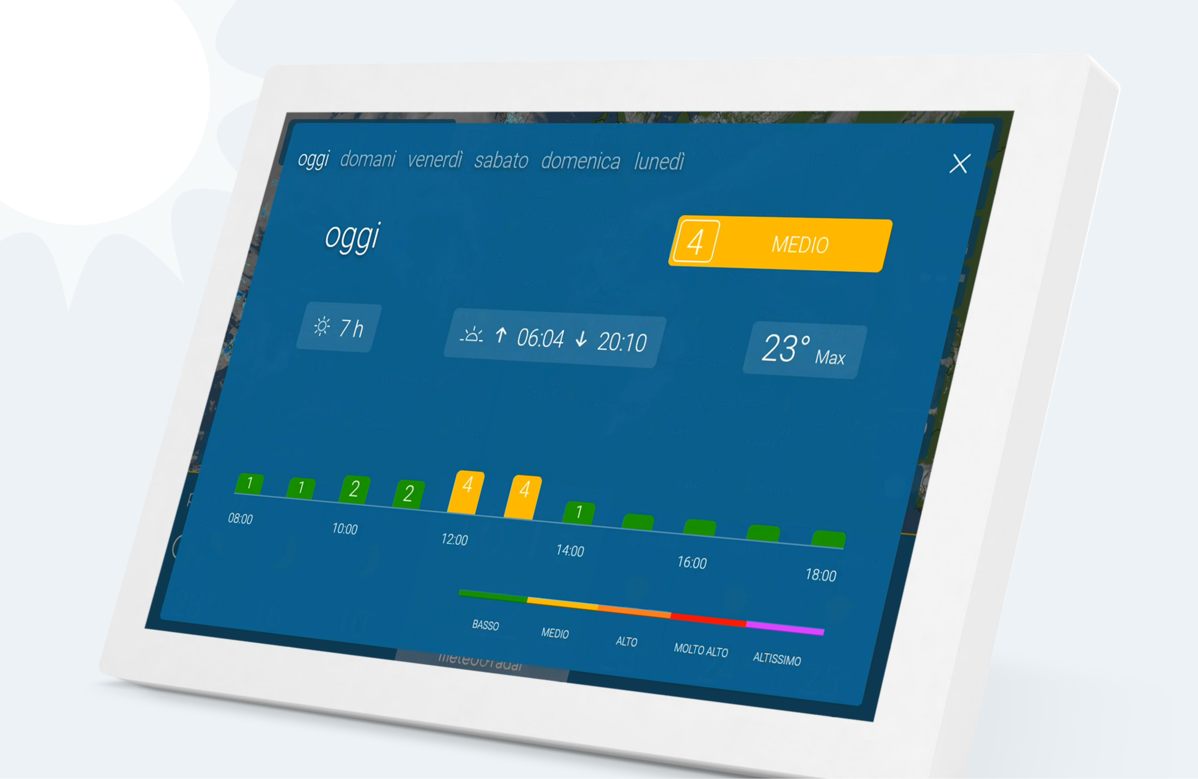 In una modalità del tutto immediata e comoda avrai il meteo in diretta: con il Radar meteo e la rappresentazione grafica delle condizioni meteorologiche nella tua località e per i prossimi 90 minuti. Con un semplice clic l’innovativo display meteo mostrerà un’animazione dei fenomeni meteorologici, con l’evoluzione del tempo per la prossima ora e mezza.