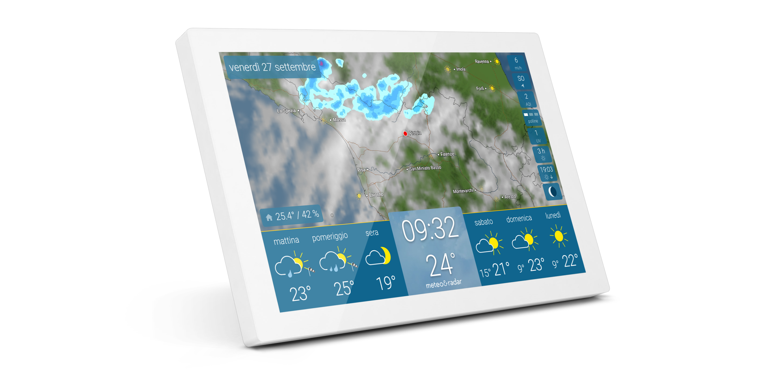 - Meteo sempre a portata di mano – grazie al supporto da parete appositamente sviluppato